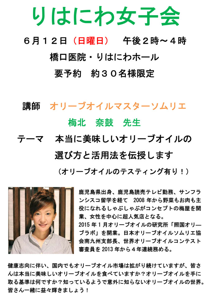 2016年6月12日(日) オリーブオイルマスターソムリエ 梅北奈鼓 さん